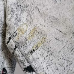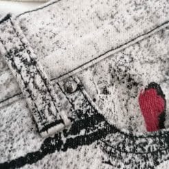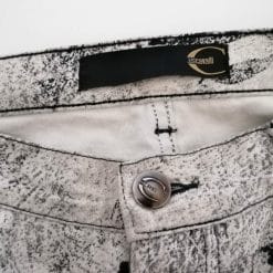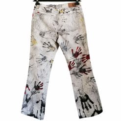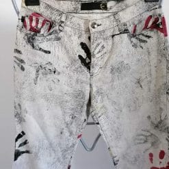 Just Cavalli jeans leggeri elasticizzati. Base grigio chiaro con impronte di mani, nero rosso e glitter oro.