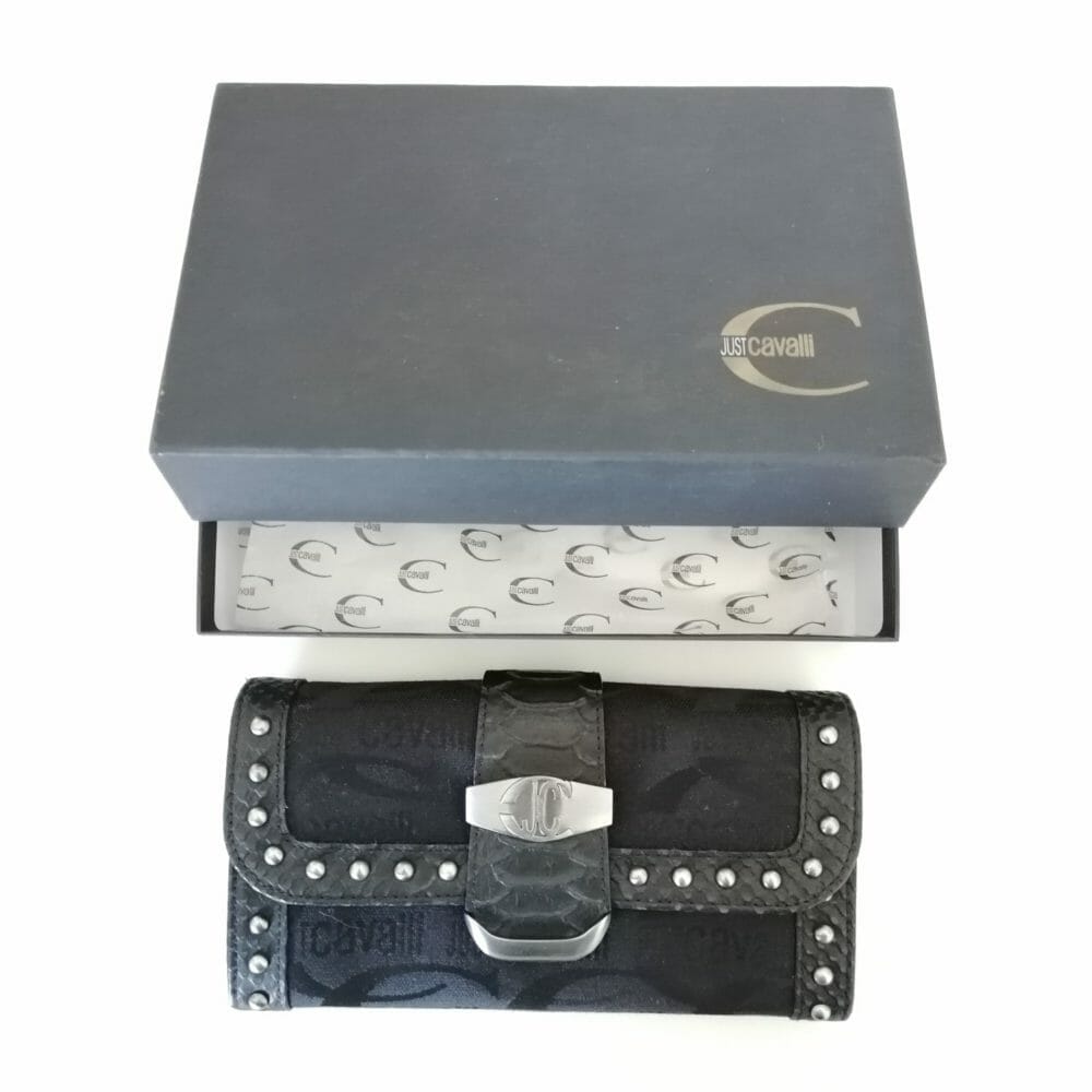 Just Cavalli portafogli da donna nuovo, con scatola e velina originali, protezioni all’interno degli scomparti. Modello nero con borchie in pelle e tessuto. All’interno etichetta con numero di serie e ologramma.