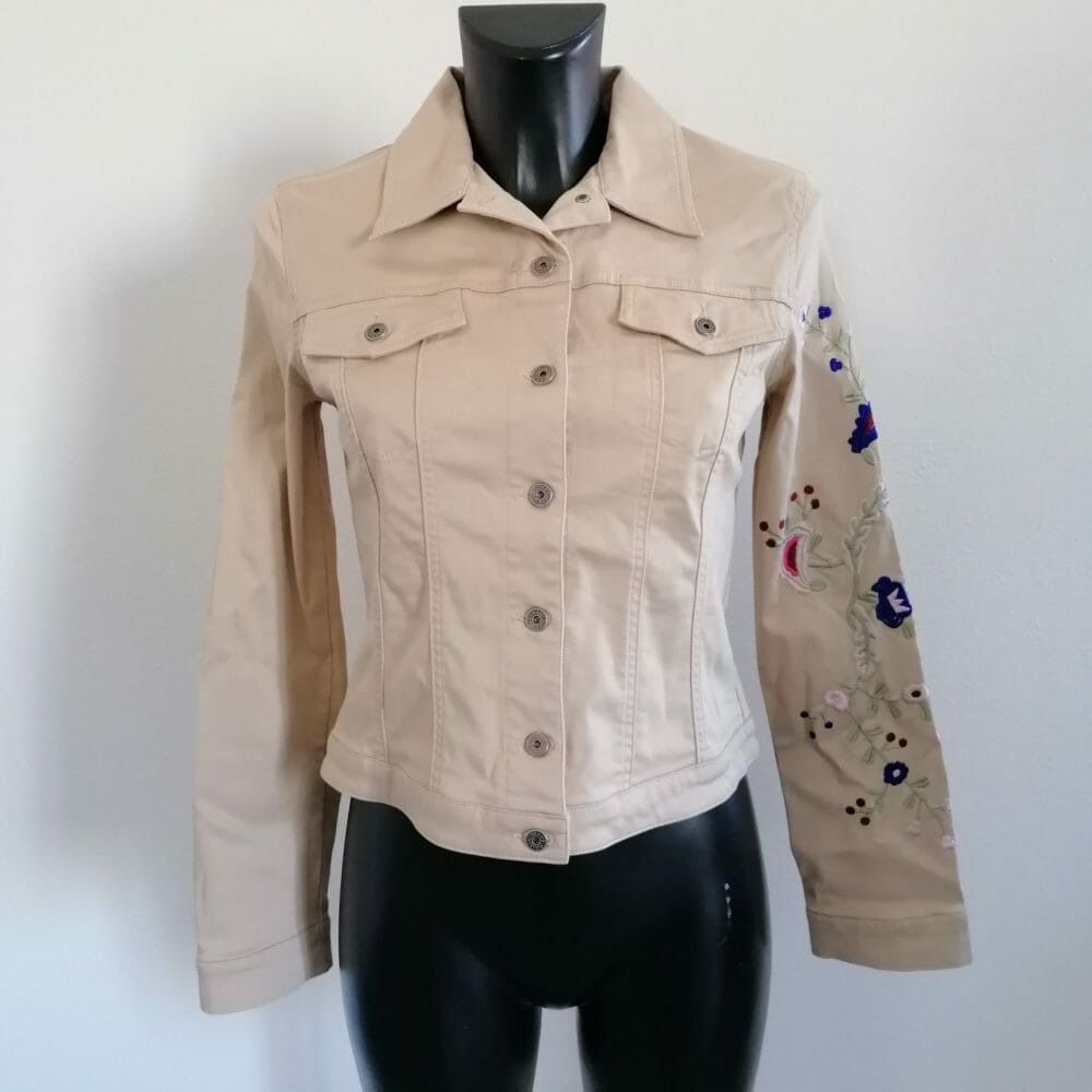 Krizia jeans, giacca leggera in cotone elasticizzato color sabbia, fiori colorati ricamati su un braccio.