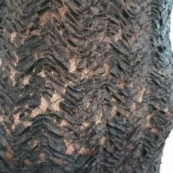 La Perla, lungo abito in pizzo nero con sottoveste elasticizzata effetto nudo. Le spalline sono attaccate davanti con bottoncini, si possono staccare e infilare posteriormente all’interno del vestito. La scollatura è delineata da ferretto rigido.