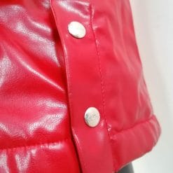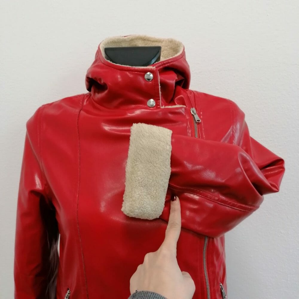 Veramente originale, giacca rossa in eco-pelle lucida foderata in finto pelo bianco con cappuccio, anni 90.