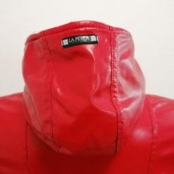 La Perla Studio, giacca con cappuccio in eco-pelle con imbottitura di pelliccia sintetica. Colore rosso con interno bianco, cerniera sul lato.