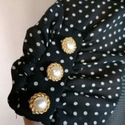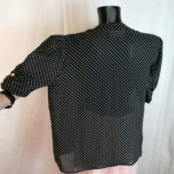 Luisa Spagnoli, blusa appena trasparente a pois bianchi su fondo nero. Mezze maniche arrucciate e leggermente a palloncino, bottoni gioiello e fiocco cucito al collo. Realizzata in poliestere.