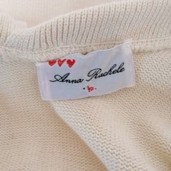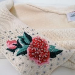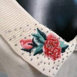 Maglioncino / top anni 50 in cotone, mezze maniche, con applicazione di perline e ricamo a valorizzare la scollatura particolare. Bellissimo capo raffinato, molto femminile, senz’altro un pezzo unico.