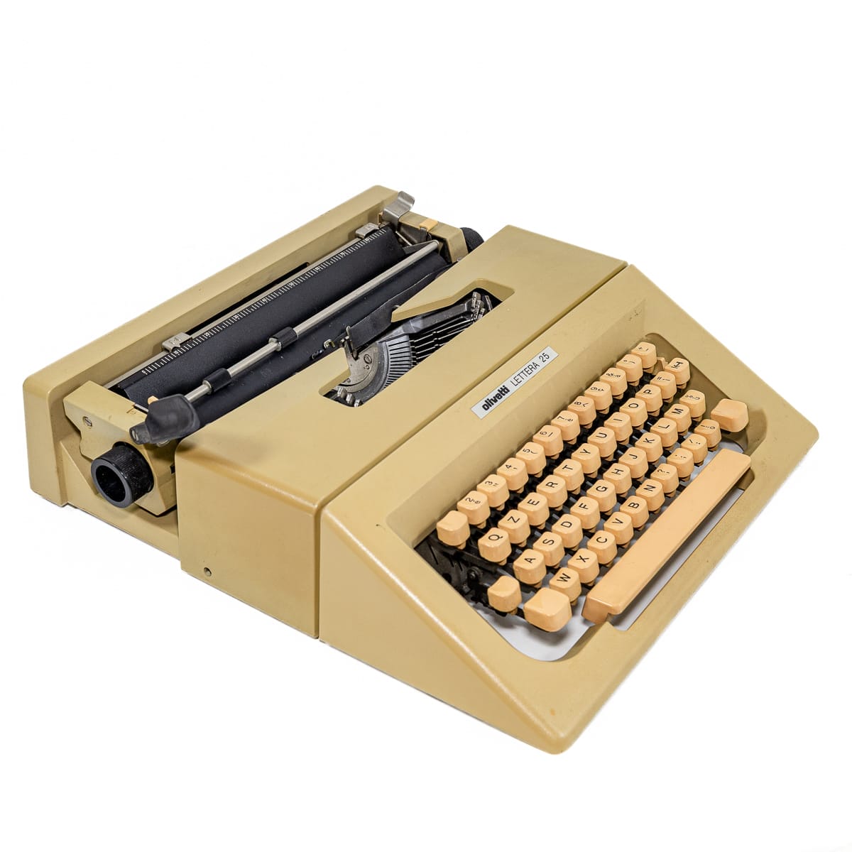 Magnifica macchina da scrivere Olivetti Lettera 25 con custodia: un’icona delle macchine da scrivere d’epoca, prodotta a partire dal 1972, che incarna la perfetta fusione tra estetica elegante e funzionalità impeccabile, tipica del genio creativo di Olivetti.