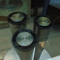 - Condizioni: Buone condizioni generali, con tre piccole sbeccature sul piano in cristallo (come da fotografie). Necessita di incollaggio della piantana con materiali appropriati e pulizia dei segni di colla residua.