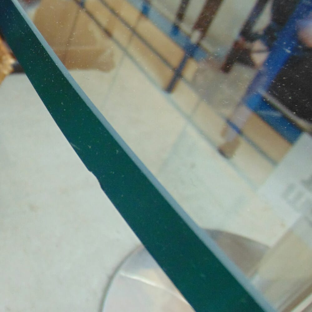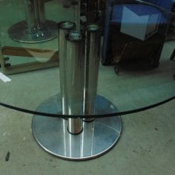 - Condizioni: Buone condizioni generali, con tre piccole sbeccature sul piano in cristallo (come da fotografie). Necessita di incollaggio della piantana con materiali appropriati e pulizia dei segni di colla residua.