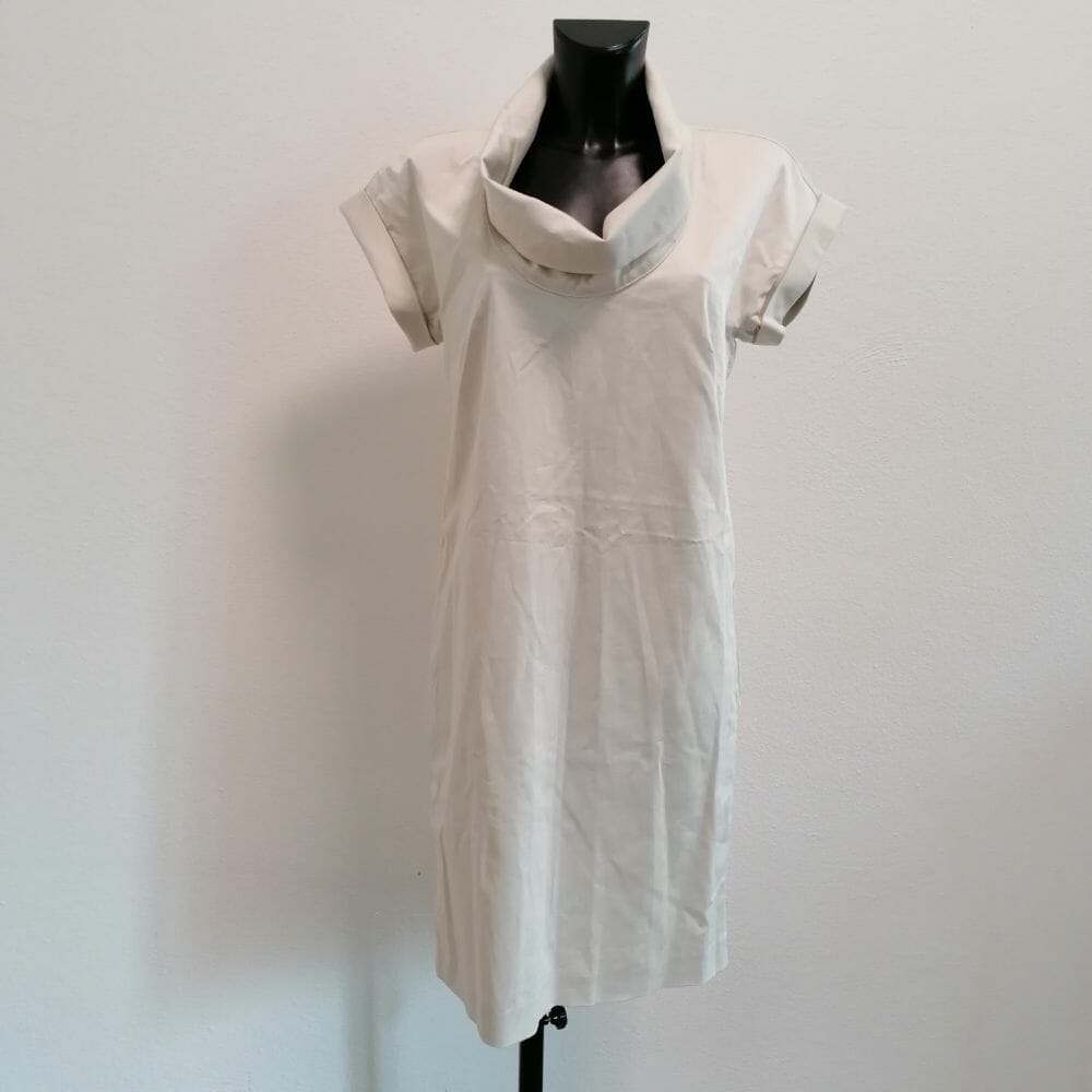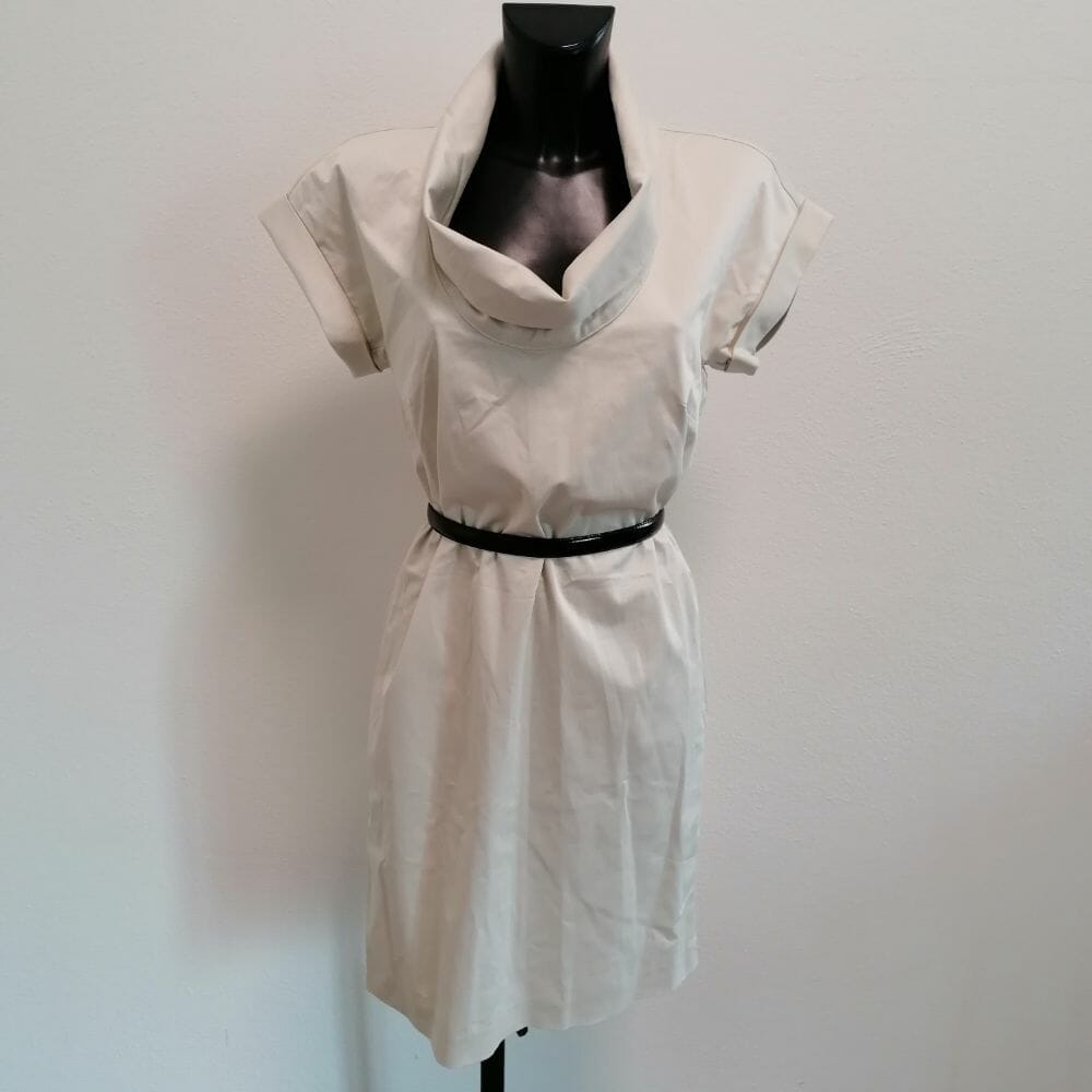 Max&Co. abito sabbia molto chiaro, maniche corte, linea appena svasata , cerniera sulla schiena e colletto particolare. Cotone 87%, lino 10%, elastam 3%. In vita ci sono due passanti minimali ma la cintura non è inclusa.