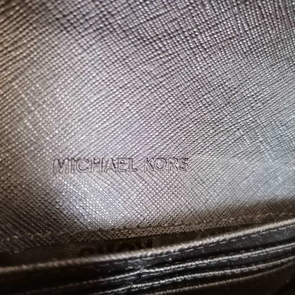Michael Kors portafogli antracite con dettagli dorati.