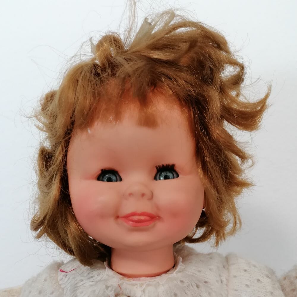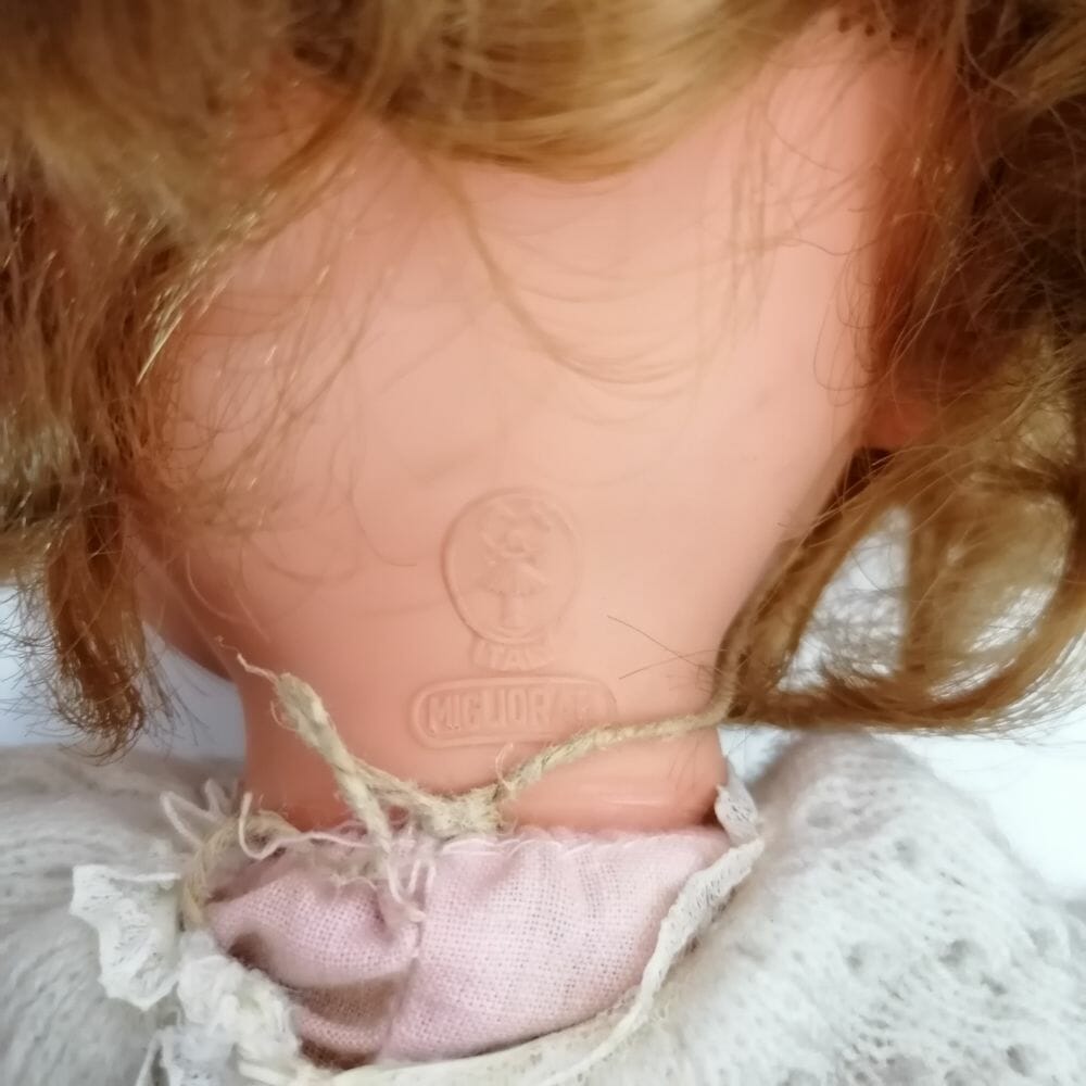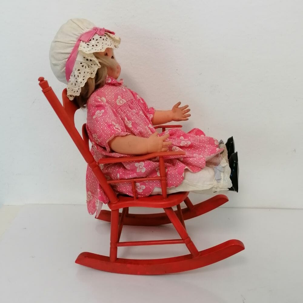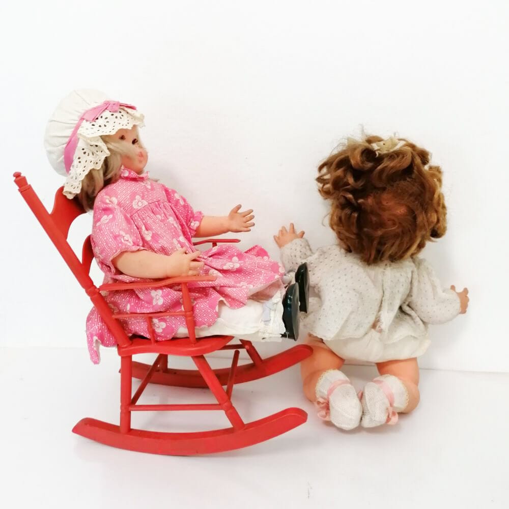 Un bambolotto vestito di rosa seduto sul dondolo, e un secondo con corpo morbido e arti di gomma. Buona condizioni generali ma da pulire, soprattutto gli abiti.