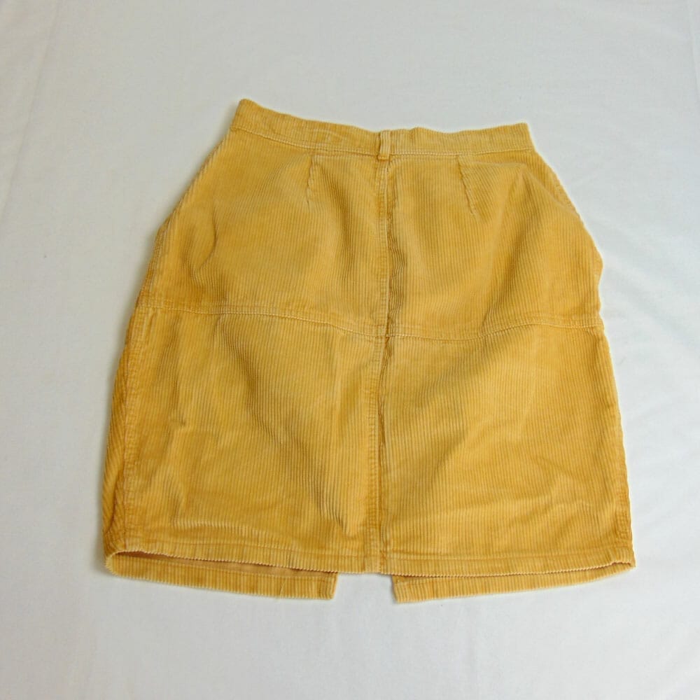 Minigonna in velluto a coste color senape, originale Sisley, linea Dungaree, vintage Anni ’80. In buone condizioni, è un capo di rara autenticità.