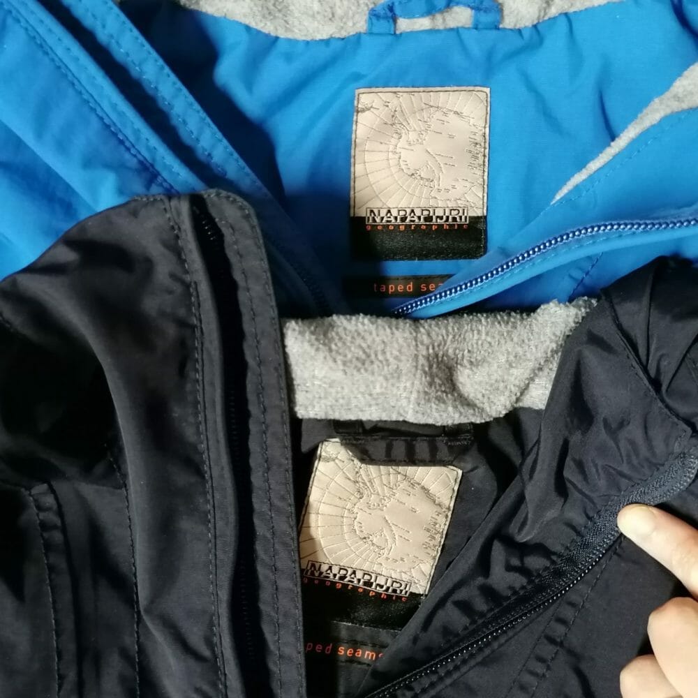 Due giacche impermeabili Napapijri per ragazzi 10 anni, una blu elettrico una blu notte. Foderate in pile, con cappuccio, hanno zip lungo tutto il fianco.