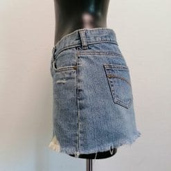 Onyx minigonna cortissima anni ’00, di jeans. Classico denim blu con effetto distressed, orlo sfrangiato.