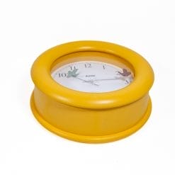 L’orologio Alessi White Bird è celebre tanto quanto l’iconico bollitore di Graves. La sua estetica audace e inconfondibile cattura immediatamente l’attenzione: un corpo in plastica di un giallo vivace, quadrante bianco con numeri neri, e le lancette decorate alle estremità con gli inconfondibili uccellini blu e bordeaux.