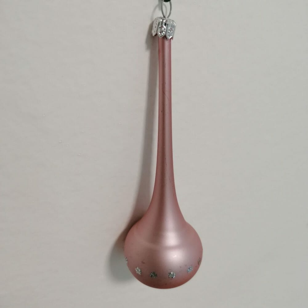 Belle e particolari, gocce da appendere all’albero di Natale in un delicato color glicine con puntini di brillantini. Otto pezzi.