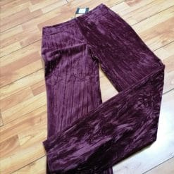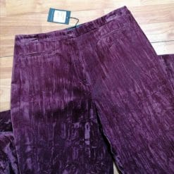 Composizione 65% rayon, 35% cotone, effetto vellutino crushed. Due tasche dritte anteriori chiusura con zip e bottone. Prezzo sul cartellino 70€.