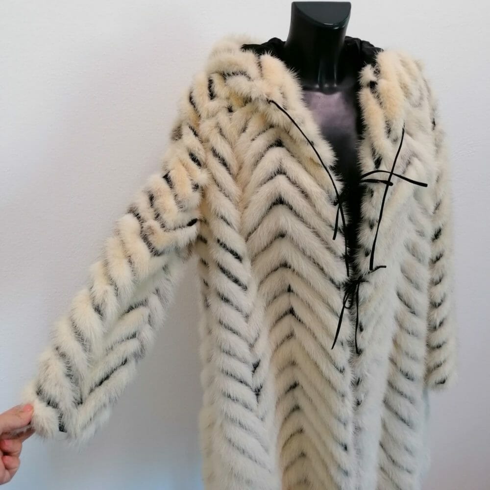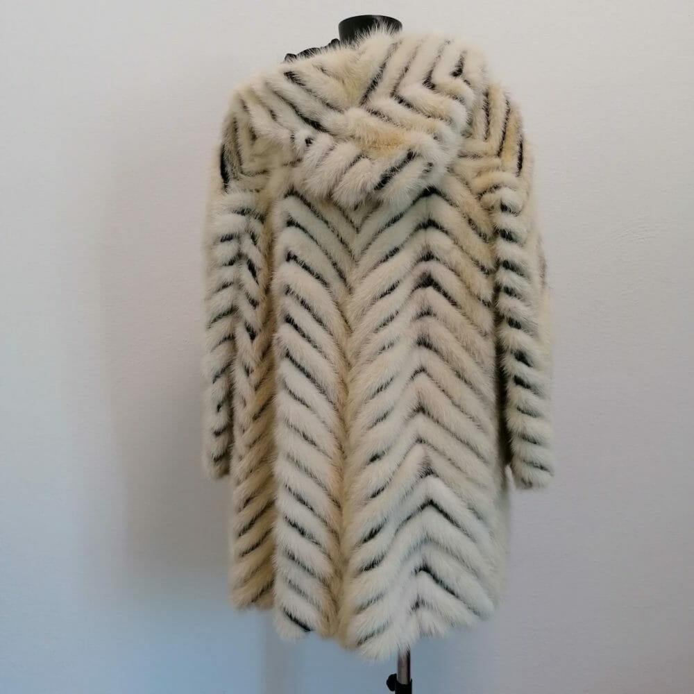Pelliccia con cappuccio vintage, lavorazione particolare e attuale, creata in un laboratorio di pelletteria milanese attorno ai primi anni duemila. Non è presente nessuna etichetta ma sembra pelo vero su una base di pelle scamosciata.
