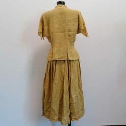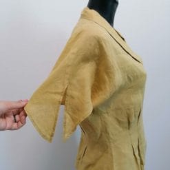 PennyBlack puro lino, completo kaki made in Italy composto da blusa con mezze maniche a pipistrello da annodare e lunga gonna a balze con passanti incrociati e una tasca.