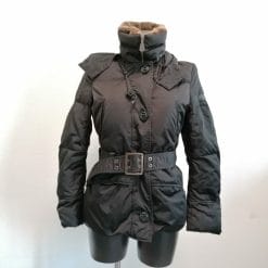 Peuterey vera piuma, piumino imbottito taglio corto e sfiancato. Colletto in vero coniglio (lapin) removibile, cappuccio removibile con visierina.