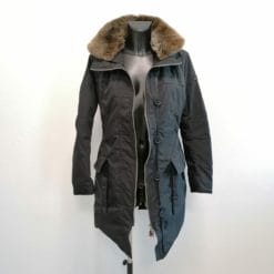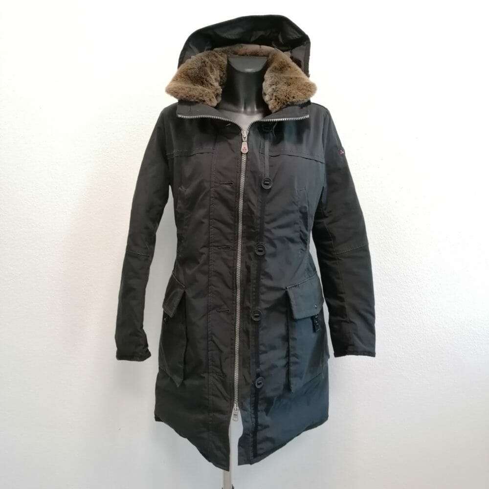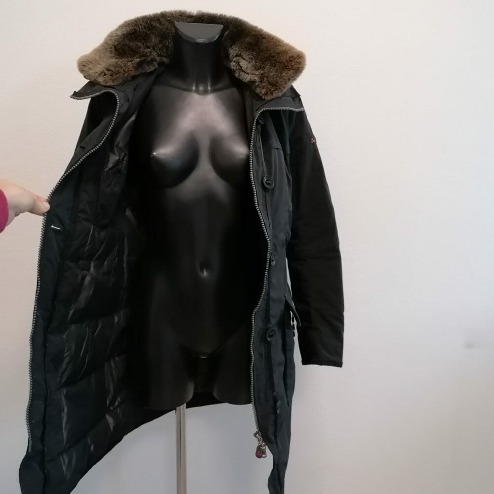 Peuterey piumino vera piuma, con colletto in pelliccia di coniglio staccabile, cappuccio. Taglio femminile sfiancato, caldo.