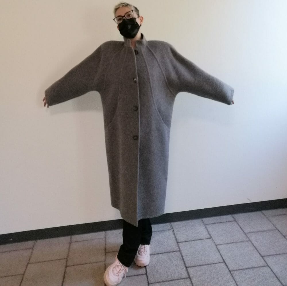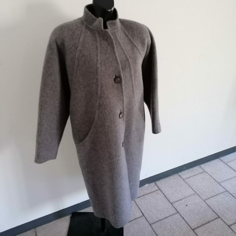 Piacenza, cappotto favoloso in alpaca 70% e lana 30%, morbidissimo. Struttura particolare, estremamente caldo, sfoderato. Spalle raglan imbottite, caratteristica linea a bozzolo. Perfetto per l’inverno.