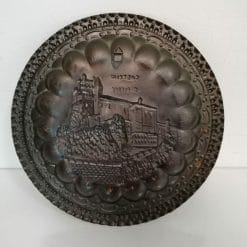 Piatto decorativo in rame lavorato a mano con la tecnica del rilievo, bella lavorazione ai bordi e rappresentazione centrale del maniero di Saint-Pierre (qui descritto nella versione italiana Castello S. Pierre) ad Aosta. Un prodotto artigianale di grande pregio.