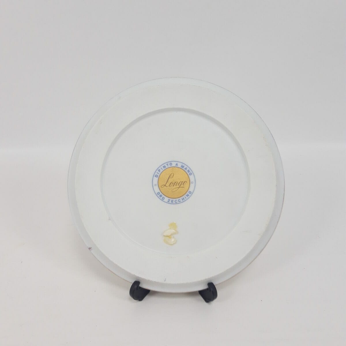 Prezioso ed elegante piatto della Longo, ditta nata negli anni 50 da un dipendente della prestigiosa Finzi. Sul piatto รจ raffigurato un angelo, L’immagine รจ ottenuta incidendo la ceramica con acidi e punte speciali e la creazione di inserti in metallo. L’oggetto รจ in ottime condizioni generali, leggeri segni d’uso sul retro; unico difetto รจ l’assenza dell’apposito (comunissimo) gancio triangolare per appenderlo al muro.