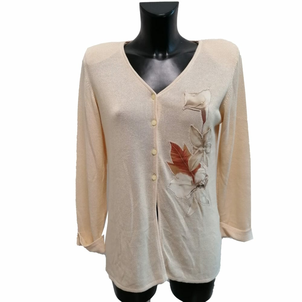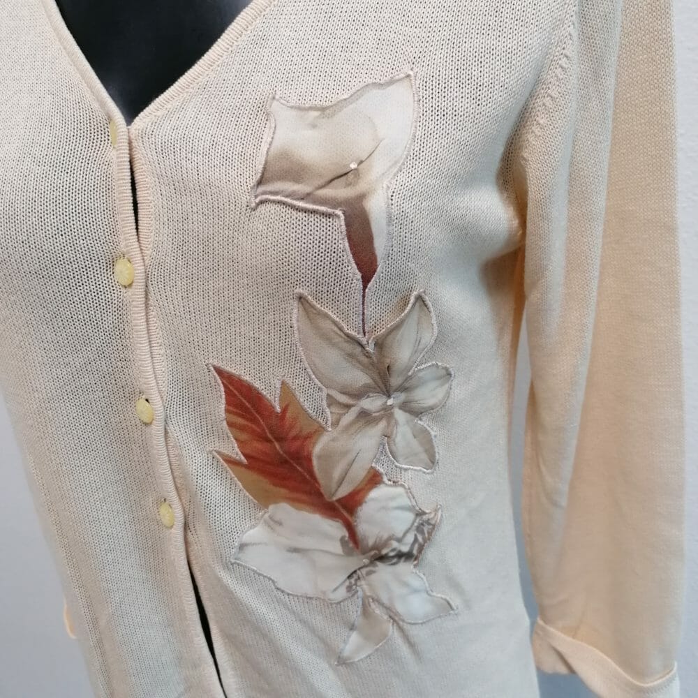 Pierre Cardin cardigan anni ’00 in filo crema con applicazione in tessuto semitrasparente floreali.