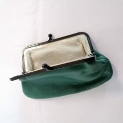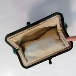Borsellino portamonete o mini pochette in pelle verde e bachelite, le dimensioni permettono un utilizzo versatile di questo oggetto di ottima fattura.