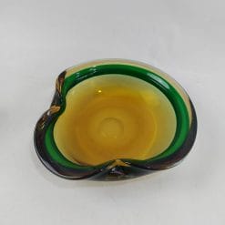 Elegantissimo posacenere o piccola ciotola della metà del secolo scorso in vetro di Murano sommerso, una tecnica sviluppata a Murano negli anni Trenta e divenuta molto popolare negli anni Cinquanta – Sessanta. Realizzato in spesso vetro verde e giallo e in ottime condizioni.
