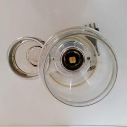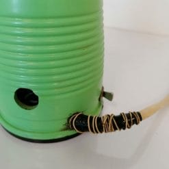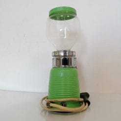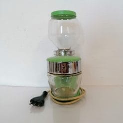 Macina caffè della Quick Mill nella variante verde acqua, funzionante. In buone condizioni, l’etichetta è leggermente spostata. Ruotando la tramoggia in vetro si regola la pezzatura dei grani di polvere di caffè. La parte meccanica funziona bene (non è stato possibile testarlo con dei grani di caffè).