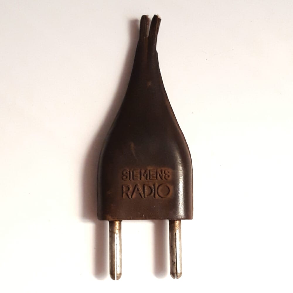 Bellissima Siemens S-524 funzionante! Un classico tra le radio dei primi anni’50. La parte in tessuto e quelle in bachelite (fronte) sono in ottime condizioni, il display è leggermente impolverato all’interno. Il mobile è pulito e in buone condizioni, presenta leggeri segni d’uso nella lucidatura (non ci sono veri e propri graffi). Manca il pannello schienale. Funziona bene, la manopola del volume fruscia poco o niente e il cambio delle stazioni è fluido. La spina originale è staccata dal cavo (ma viene fornita) che presenta segni d’invecchiamento; nella zona di giunzione con la spina è “cotto” e si sbriciola; il cavo dell’antenna è un po’ rigido ma si presta al normale utilizzo.