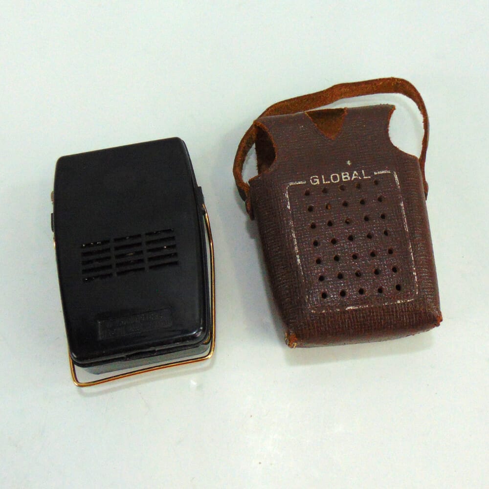 Radiolina portatile vintage Global Transistor, degli inizi anni ’60, funzionante con batteria da 9 V descritta nella scheda del radio museum: https://www.radiomuseum.org/r/unknown_global_gr_711gr71.html