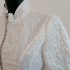RoccoBarocco giacca corta sciancrata, bianca, con cerniera e due tasche frontali.