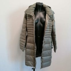 Romeo Gigli piumino vera piuma da donna, con cappuccio staccabile, cintura. Taglio femminile sfiancato, caldo. Alta qualità, morbido, rifinito, particolare tinta bronzo cangiante.
