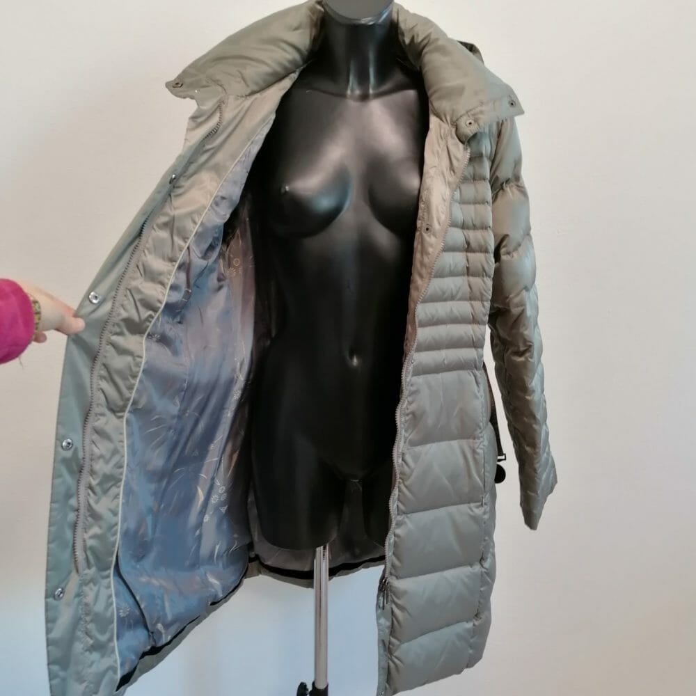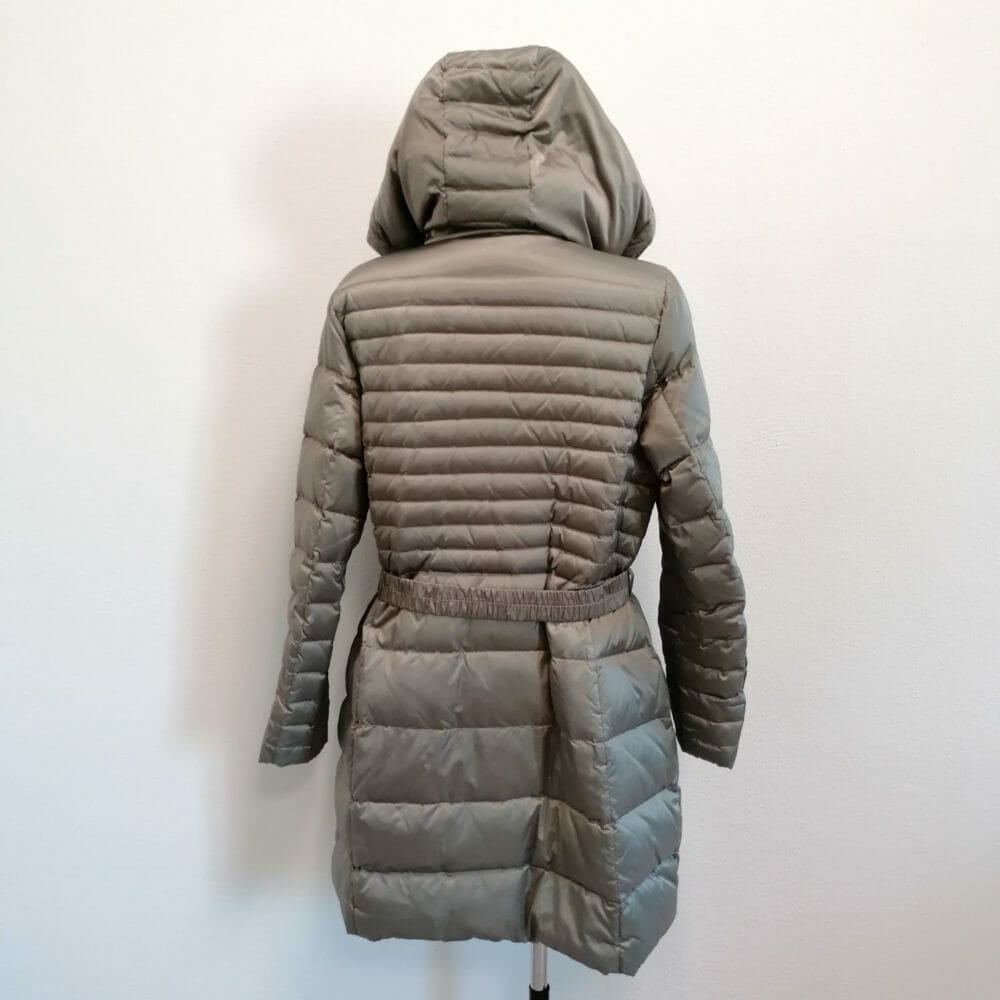 Romeo Gigli piumino vera piuma da donna, con cappuccio staccabile, cintura. Taglio femminile sfiancato, caldo. Alta qualità, morbido, rifinito, particolare tinta bronzo cangiante.