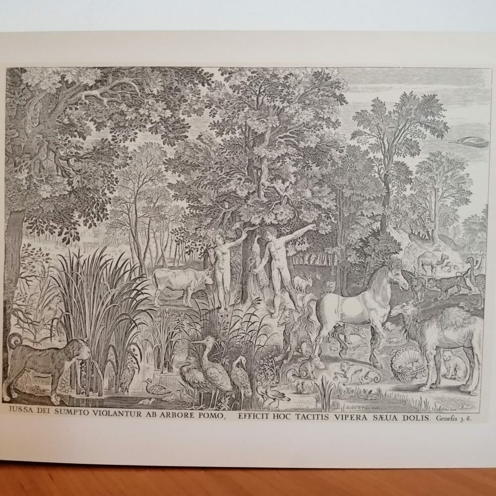 Volume di grandi dimensioni, copertina cartonata, 28 x 38 cm, con 134 tavole in bianco e nero che riproducono tutte le incisioni della Bibbia Ernestina (Norimberga 1670). Ogni tavola porta una descrizione a fronte. Ben conservato.