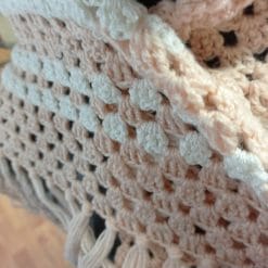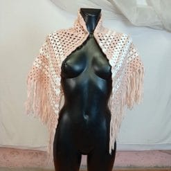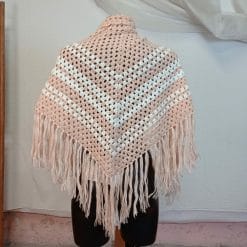 Scialle rosa a righe in lana fatto a mano, con frange.