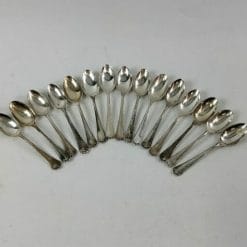 Arricchisci la tua collezione di posate con questo elegante servizio di cucchiaini da caffè in argento 800. Composto da 15 pezzi, questo servizio completo di cucchiai è realizzato con materiali di alta qualità e presenta una raffinata punzonatura che ne attesta l’autenticità e il valore.