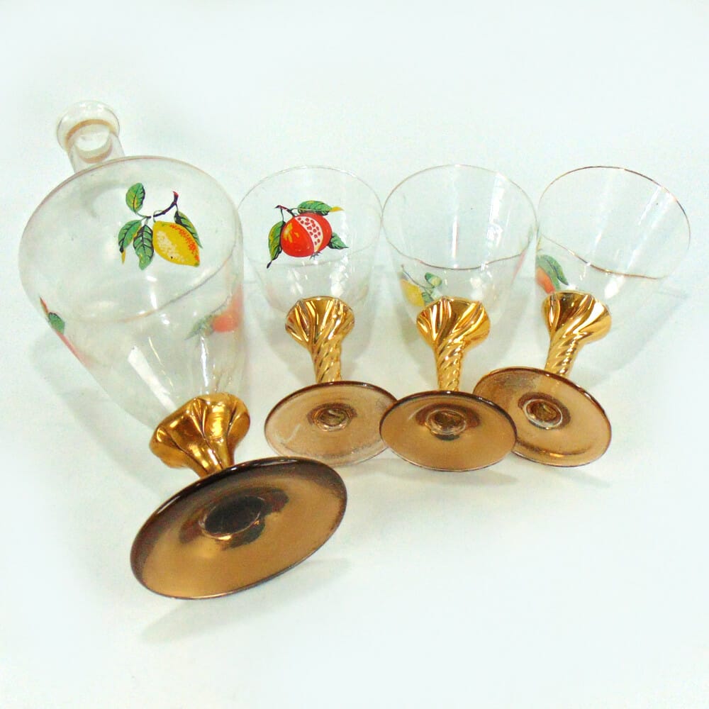 Set bottiglia e tre bicchieri con decorazioni a tema frutta serigrafate, e con basi e bordature dorate. Uno squisito supporto per offrire bevande con stile e vivacità.