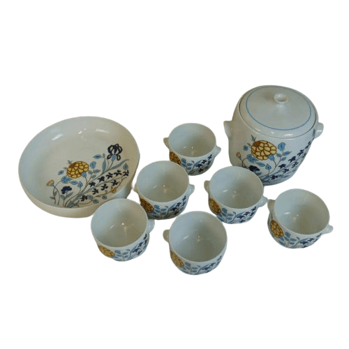 Scopri l’esclusivo set brodo in ceramica smaltata Richard Ginori degli anni ’70. Questo meraviglioso set, composto da zuppiera, 6 tazze e piatto per il pane, offre un’eleganza senza tempo con la sua raffinata grafica floreale colorata, tipica dell’epoca.
