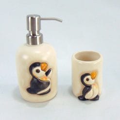 Set da bagno originale Thun, composto di bicchiere porta spazzolini e dispenser per sapone, con simpatici pinguini, dotati di confezione originale. Uno stile inconfondibile.
