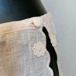 Una vera favola questo completo vintage di lingerie composto da una delicatissimo mutandina a pantaloncino aperta sui lati, rifinita con bottoncini risoperti e laccetti, accostata ad una canotta semplice ma d’effetto con spalline sottili, balza finale e fiorellini applicati.