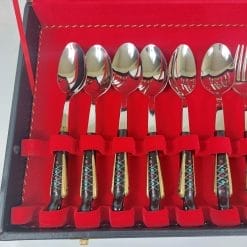 Bellissimo e raro set di posate artigianali, realizzate con manico in corno di bufalo intarsiato con ottone, rame e madreperla. Il manico è decorato a mano, eseguito dalla bottega Eid Bou Rached a Jezzine, Libano,  e ricorda un uccellino. Il set di posate comprende 6 coltelli, 6 cucchiai e 6 forchette.