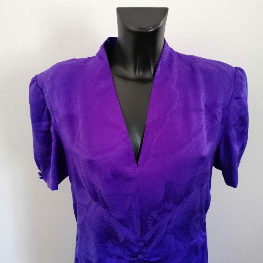 Seta, abito handmade vintage sartoriale con arricciatura e finti bottoni centrali, colore viola intenso