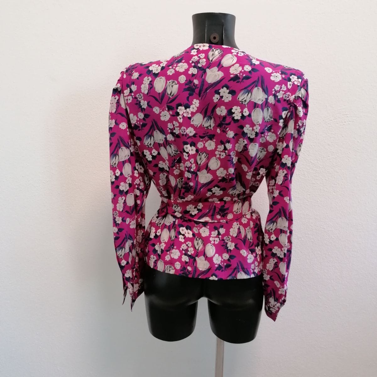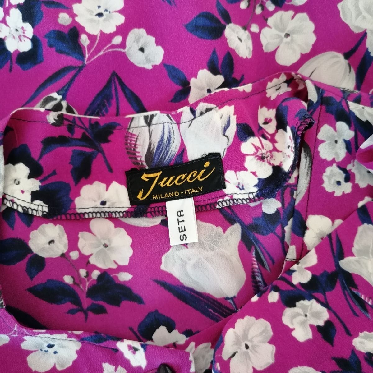 Collo tondo senza colletto, fondo dritto, polsini ben delineati con bottoni, questa blusa valorizza il bellissimo materiale con una fantasia floreale allegra ma non chiassosa.