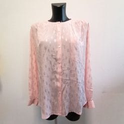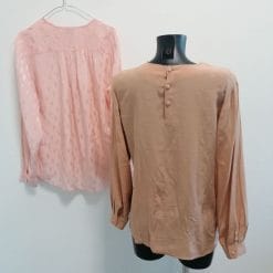 • La seconda camicetta ha un colore interessante tra rosa antico e marrone biscotto, senza colletto con pieghe sul petto, due tasche frontali, bottoni sulla schiena. Strutturata e d’aspetto prezioso.