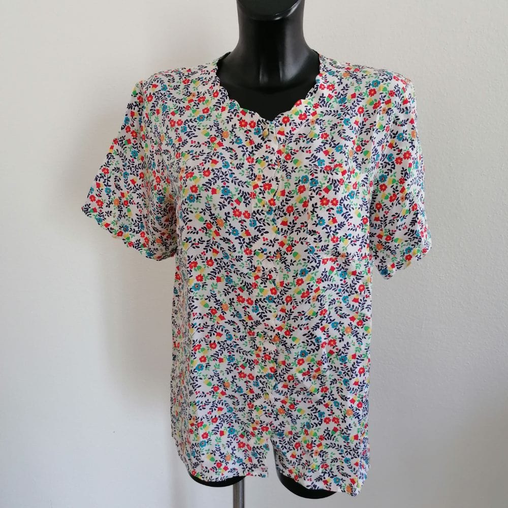 Pura seta, camicetta vintage a fiori, taglio ampio. Bottoncini ricoperti e bordi smerlati.