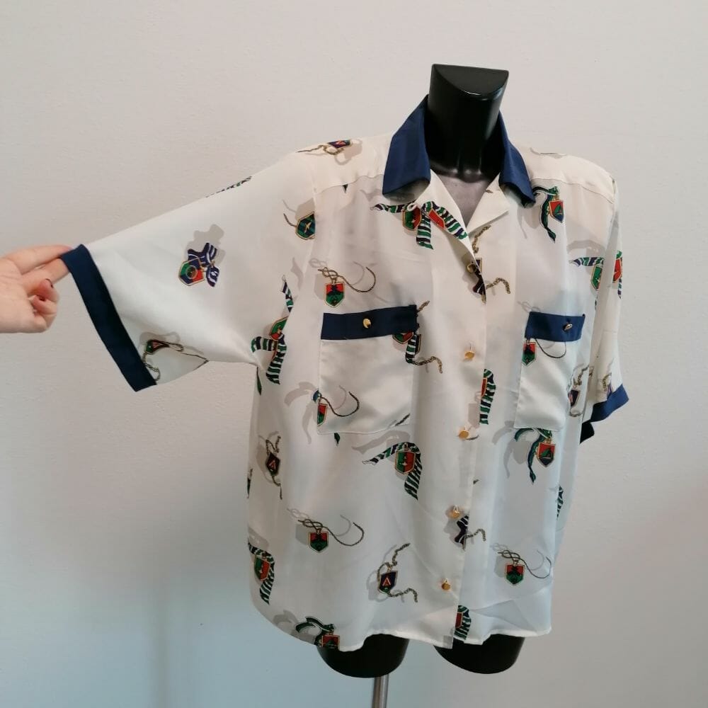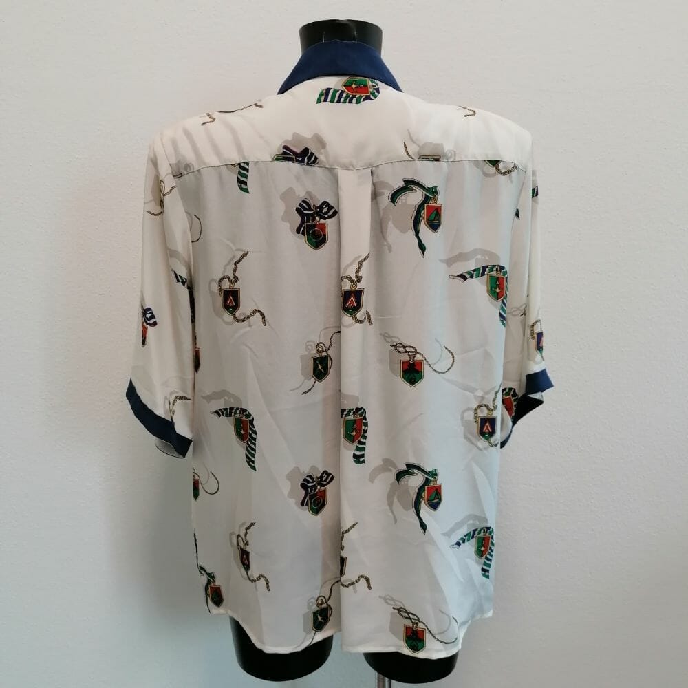 Pura seta, camicetta vintage bianco e blu con dettagli dorati.