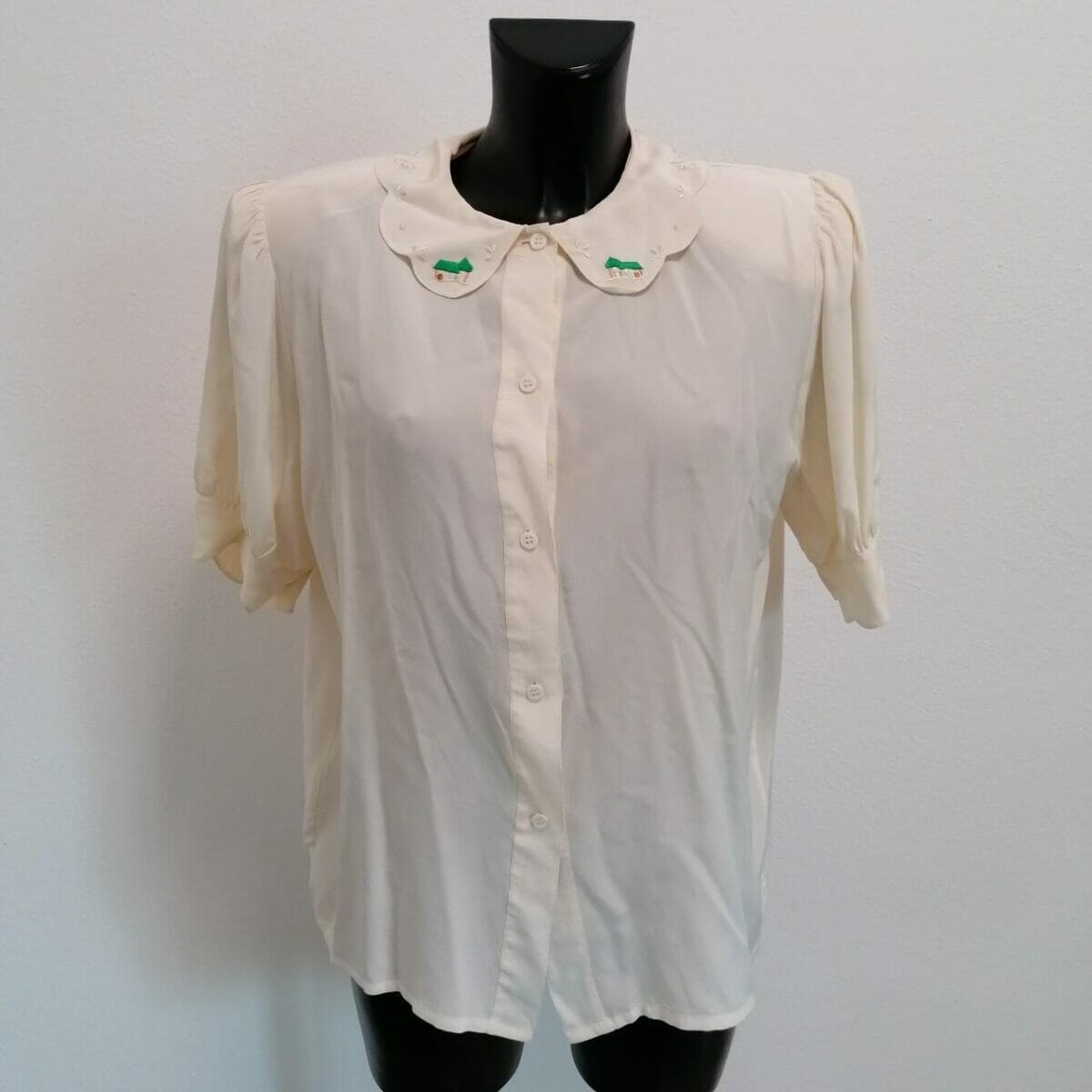 Femminile e romantica, questa camicia di seta bianca vintage con collo ricamato e maniche corte a palloncino è un capo versatile che può essere indossato in diverse occasioni. Può essere abbinata a una gonna svolazzante per creare un look romantico e femminile, oppure a un paio di jeans a vita alta per uno stile più casual ma sofisticato. La sua combinazione di elementi vintage e dettagli decorativi la rende un pezzo di abbigliamento unico e speciale, perfetto per chi ama il fascino senza tempo della moda d’antan.
